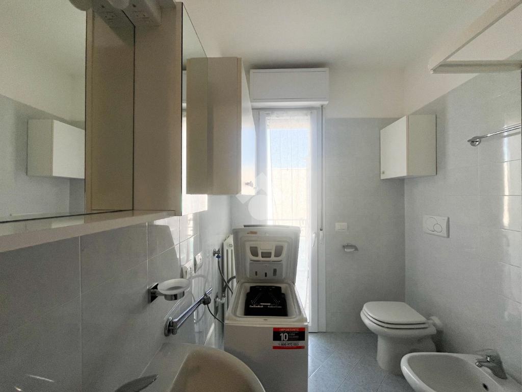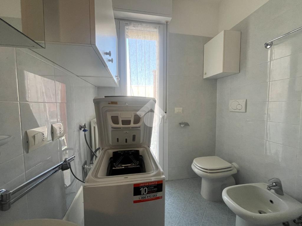 Il bagno è dotato di box doccia, attacco per la lavatrice e accesso diretto a un gradevole terrazzino, che garantisce uno sfogo esterno e una piacevole aerazione naturale.