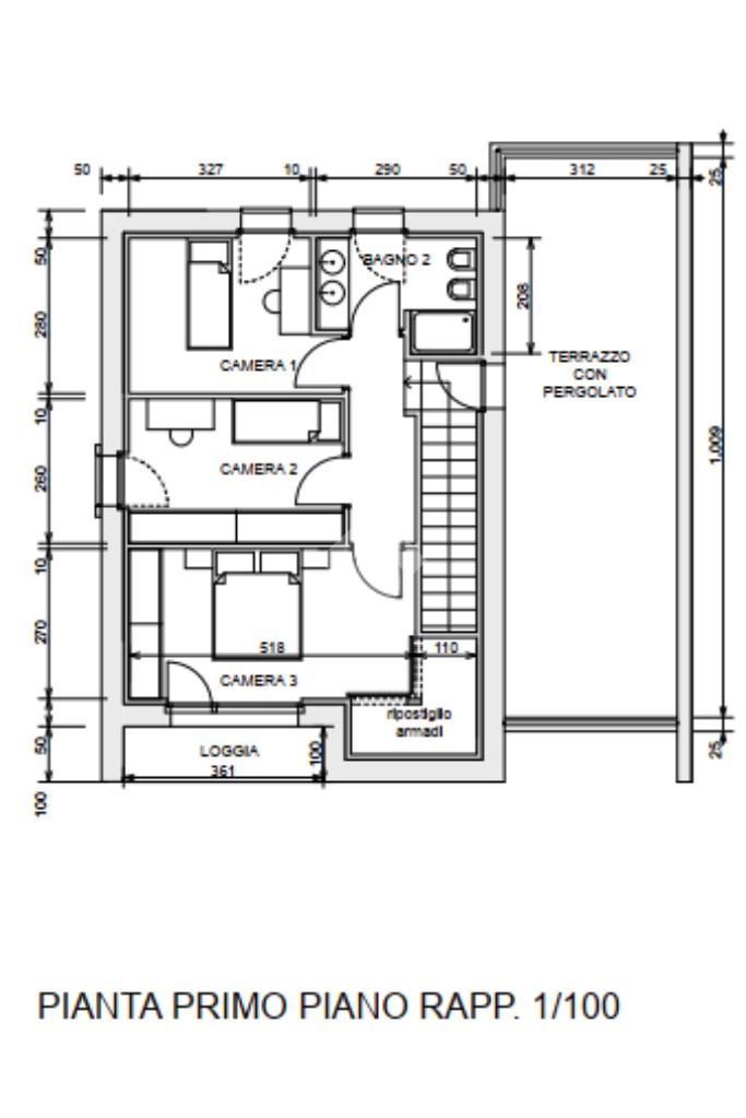 Al primo piano si sviluppa la zona notte, con tre camere da letto accoglienti, un bagno, un comodo ripostiglio e una loggia. Completa il piano un ampio terrazzo, perfetto per godersi il sole, creare una zona relax o uno spazio verde privato.